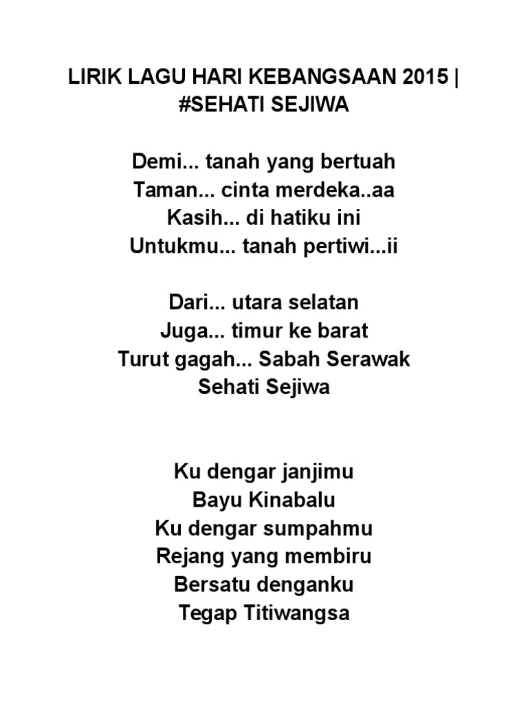 Lagu ini dinyanyikan oleh Alif Satar choir penyanyi latar. Lirik Lagu Hari Kebangsaan 2015 Tema Hari Kebangsaan 2015 pada tahun ini adalah sehati sejiwa yang menggambarkan perpaduan kesefahaman bersatu seluruh rakyat Malaysia. Lagu patriotik Other contents.
