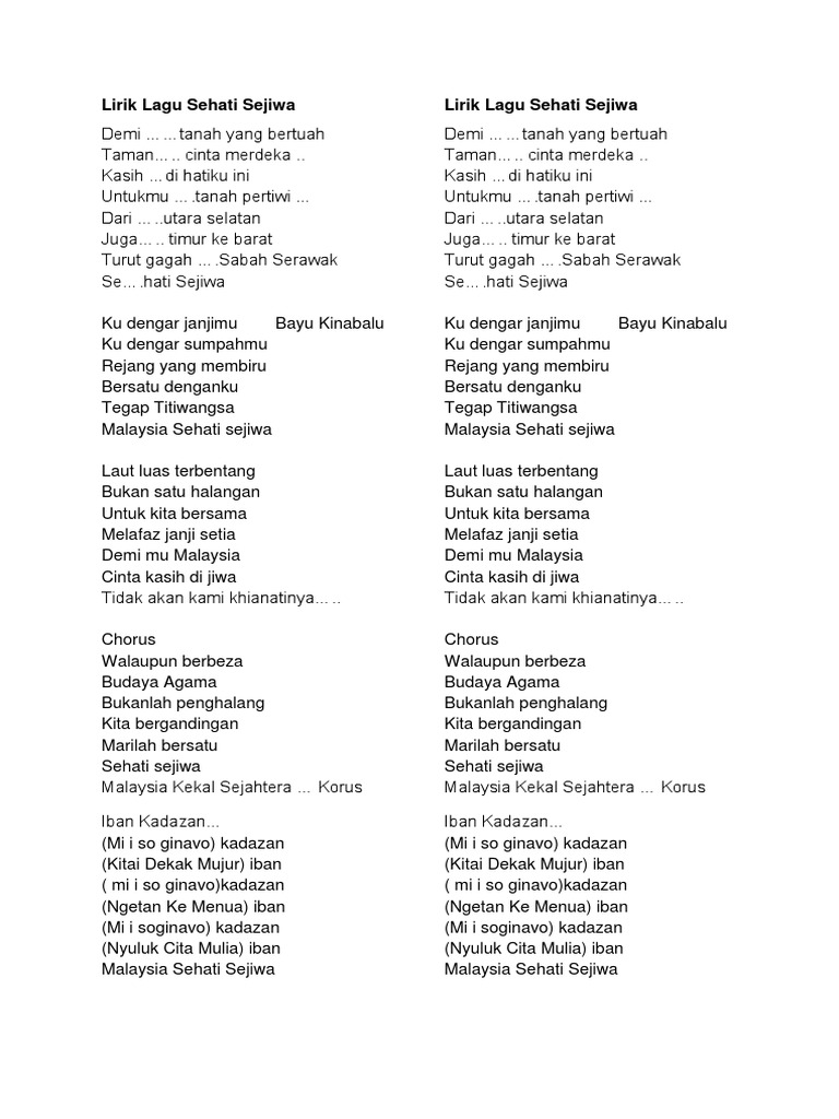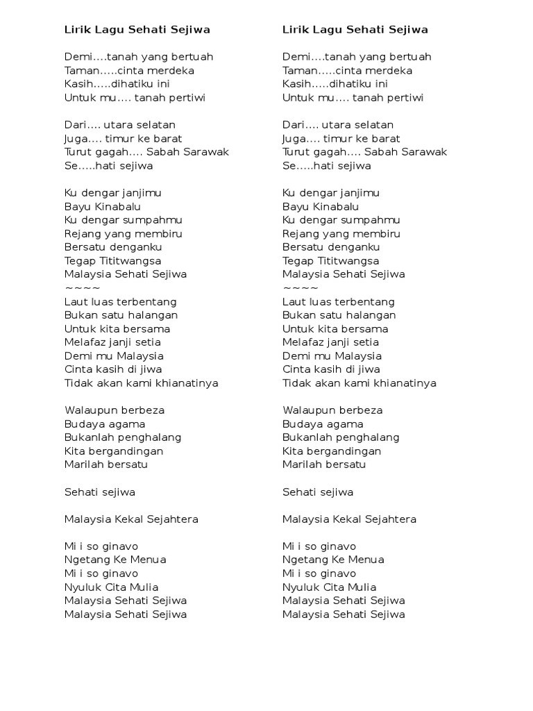 Muhammad Yuri EdrisLirik. Dari utara selatan Juga timur ke barat Turut gagah Sabah Serawak Sehati Sejiwa. Lirik Lagu Sehati Sejiwa Alif Satar Gemersik Chorus.